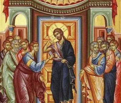Όταν ο αναστημένος Κύριος εμφανίσθηκε  για πρώτη φορά ενώπιον των μαθητών Του την ημέρα της Αναστάσεώς Του, τότε ο Απόστολος Θωμάς απουσίαζε, γι΄ αυτό και αμφισβήτησε την Ανάσταση του Κυρίου. Σήμερα, κατά την όγδοη ημέρα, ο Ευαγγελιστής Ιωάννης μάς πληροφορεί ότι ο Κύριος εμφανίσθηκε και πάλι ενώπιον των μαθητών Του, αλλά αυτή τη φορά παρόντος και του Αποστόλου Θωμά.