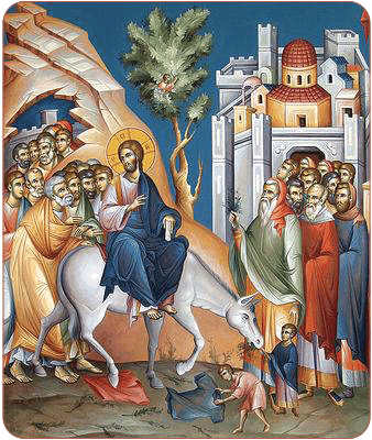 Ο Κύριος μετά από εκεί ανηφόρησε προς την Ιερουσαλήμ, όπου του έγινε υποδοχή Βασιλέως. Εισήλθε δε στην αγία Πόλη καθισμένος επάνω σε ένα μικρό γαϊδουράκι, δείχνοντας έτσι ότι εισέρχεται ως Βασιλιάς της Ειρήνης, καθώς το γαϊδουράκι συμβολίζει πάντα την ειρήνη, ενώ το άλογο τον πόλεμο.