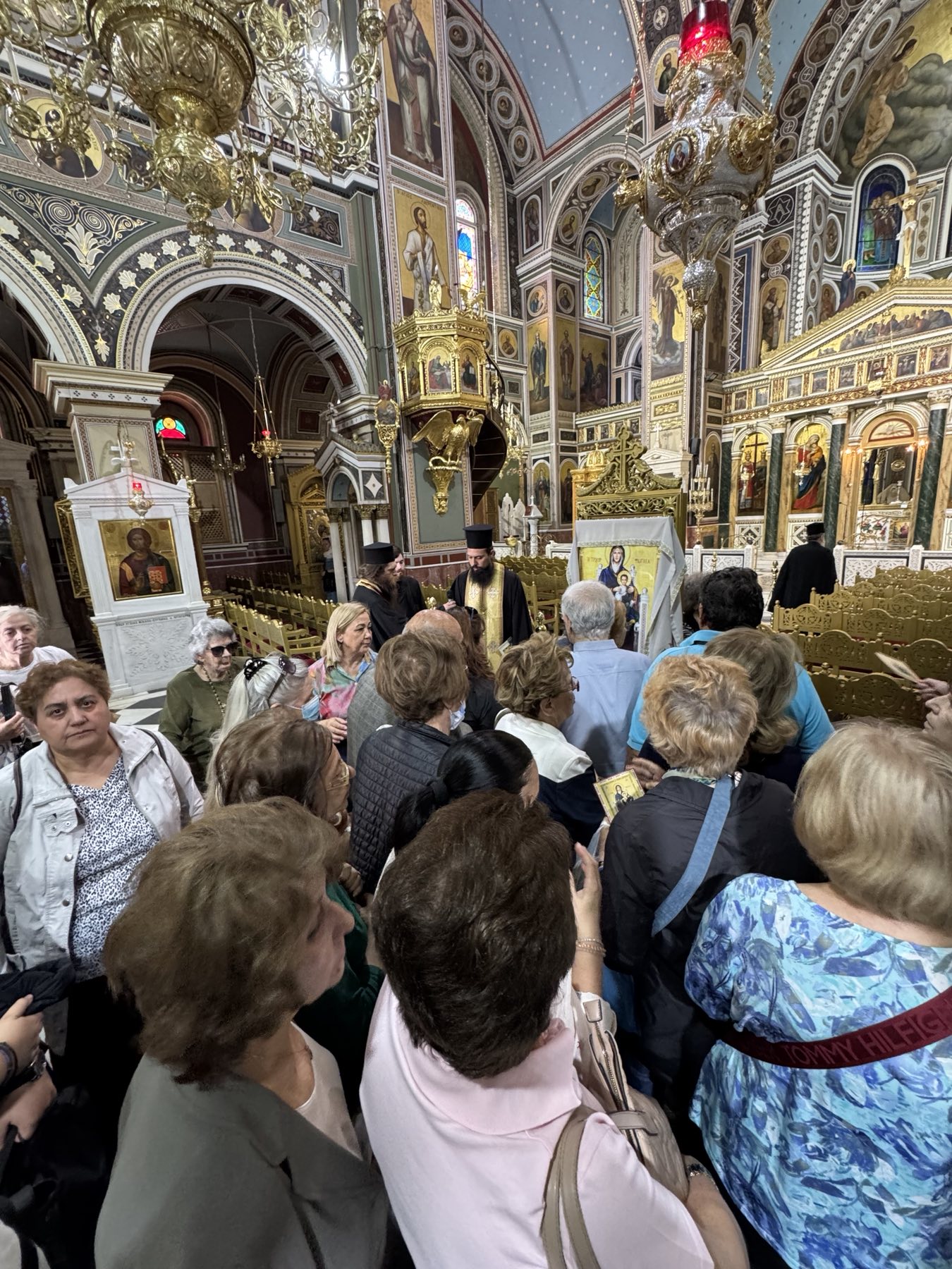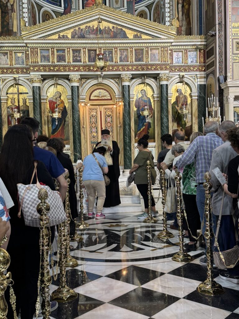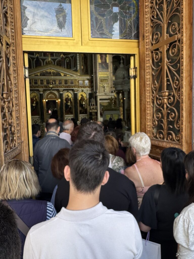 Αρκετοί προσκυνητές περίμεναν με χαρά τον Άγιο Σεραφείμ, όπου τον υποδέχθηκαν με καμπανοκρουσίες στα προπύλαια του Ιερού Ναού με τους ιερείς του Ιερού Ναού.