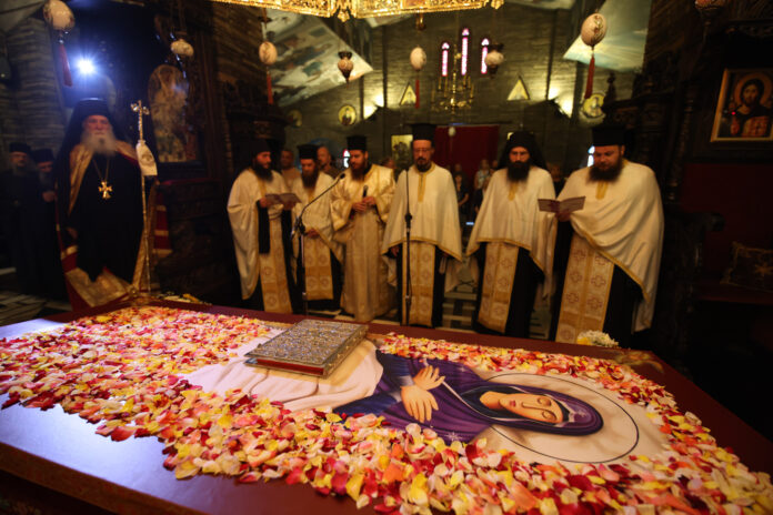 Στο τέλος ακολούθησε η περιφορά του σώματος της Θεοτόκου στον αύλειο χώρο της Ιεράς Μονής.